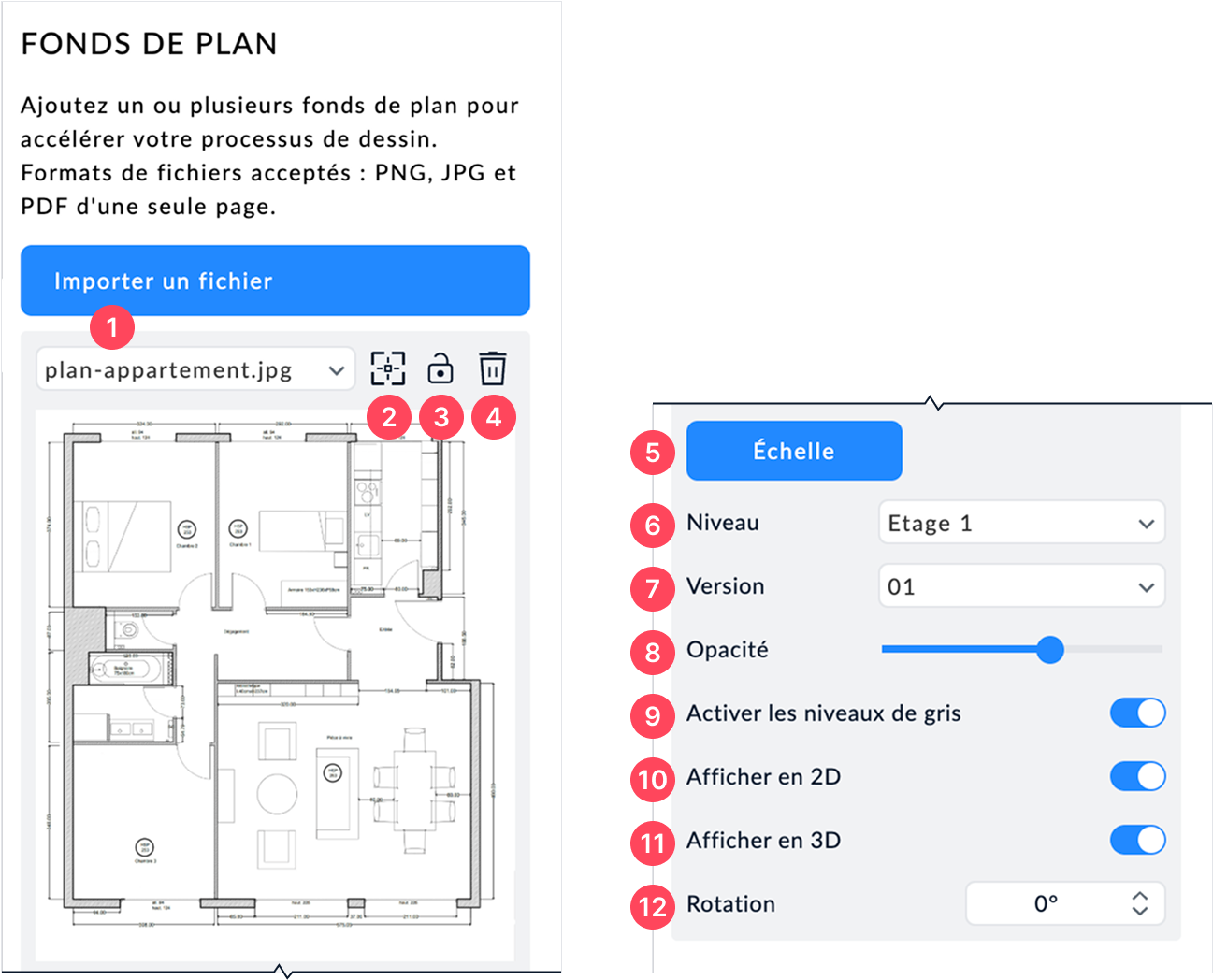 Si vous avez importé plusieurs plans, sélectionnez-en un via le menu déroulant. Cela vous permet d’associer chaque fichier à un niveau différent (étage, sous-sol, etc.).