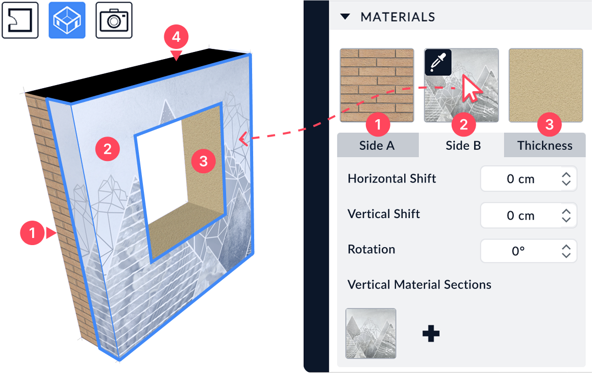 This feature allows you to apply multiple materials to the same wall without splitting it. You can divide a wall into distinct vertical sections and assign each one a different finish.